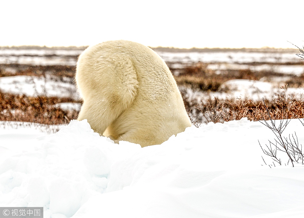 2019年2月21日讯,加拿大哈德逊湾,野生动物摄影师珍妮·史蒂文斯(Jenny Stevens)拍到一只北极熊在雪地里打滚时笨拙而可爱的照片。这只成年北极熊像孩子一样高兴地在雪堆里打滚,时而把头钻进雪地里,时而把腿伸向空中,玩得不亦乐乎。