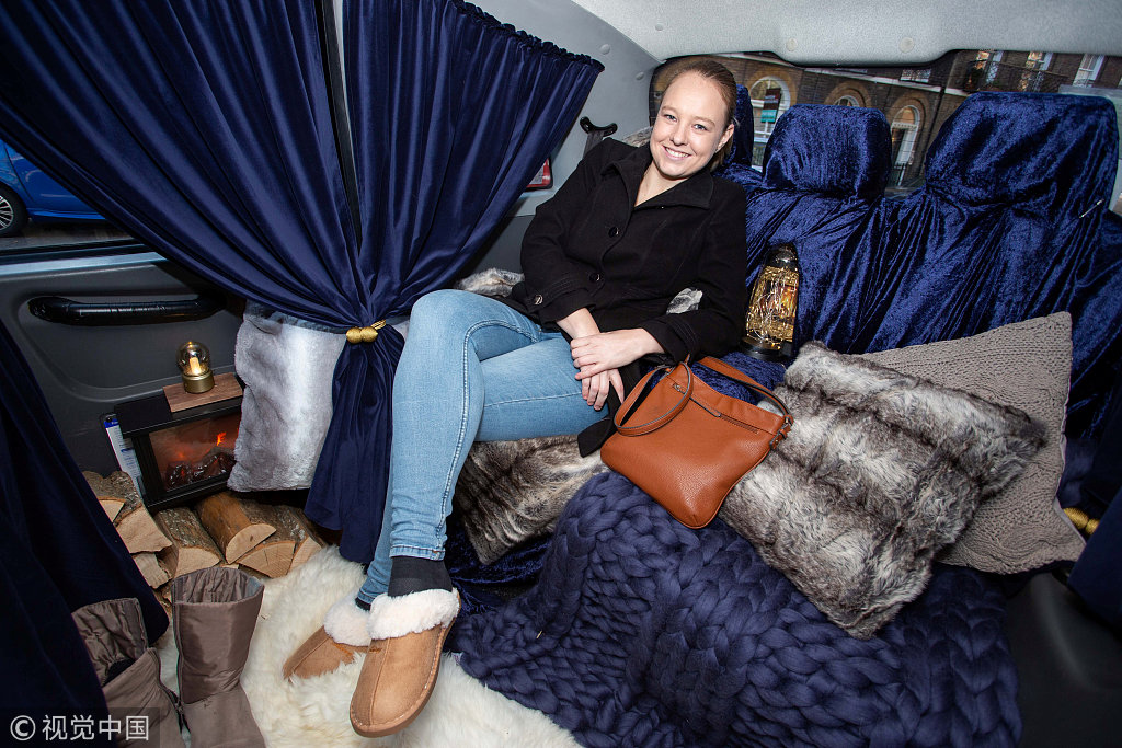 2019年2月21日讯,英国伦敦,伦敦出租车司机罗斯将自己的座驾进行大胆改装,使其摇身一变,堪称“世界上最舒适的出租车”。这辆外型传统的黑色出租车内部现在配有天鹅绒座椅、蓝色天鹅绒窗帘、羊皮地毯以及安装在乘客门上的仿制壁炉,“壁炉”外还码放着原木来制造视觉效果。除此之外,出租车里的乘客甚至会得到一双羊皮拖鞋,让他们的脚在一天的开始时处于最佳状态。它的内部看上去舒适、豪华,让人如同置身于温暖的乡村小木屋中。如今,这辆独一无二的“小木屋”出租车正在试运营中,被选中的幸运通勤者将能够免费乘坐它去上班。
