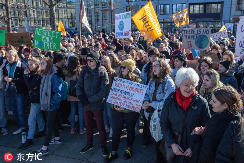 当地时间2019年2月22日,德国柏林,德国青少年参加游行,抗议全球气候变暖。一场为气候罢课的学生运动正在国际范围内发展蔓延,青少年学生们纷纷翘课,走上街头参加游行,他们高举“没有B星球”、“尊重地球母亲”等标语,呼吁采取行动保护气候和落实《巴黎协定》。