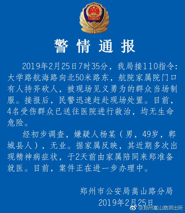据河南郑州市公安局嵩山路分局通报,2019年2月25日7时35分,公安局接110指令:大学路航海路向北50米路东,航院家属院门口有人持斧砍人,被现场见义勇为的群众当场制服。接报后,民警迅速赶赴现场处置。目前,4名受伤群众已送往医院进行救治,均无生命危险。