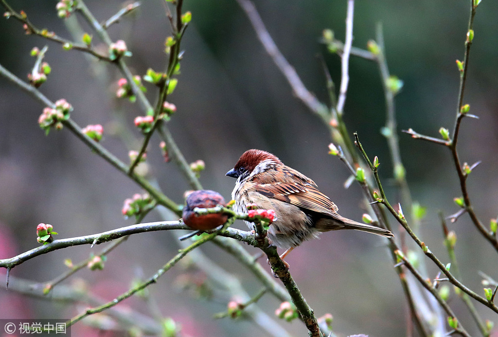 2019年2月28日,安徽休宁,金佛山生态公园的梅花绽放,小鸟飞落在枝头上,与梅花相映成趣,令人感受到浓浓的春意。