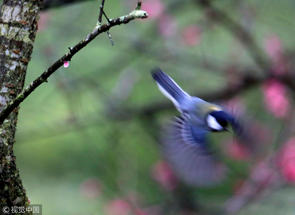 2019年2月28日,安徽休宁,金佛山生态公园的梅花绽放,小鸟飞落在枝头上,与梅花相映成趣,令人感受到浓浓的春意。
