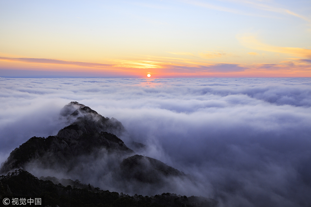 2019年2月28日,在安徽黄山核心景区拍摄的晚霞、云海和雾淞景观。傍晚时分,一场壮美的云海光临黄山之巅,与奇松、怪石、晚霞、雾淞万象辉映,令万余名中外游客和摄影爱好者享受一场视觉盛宴。