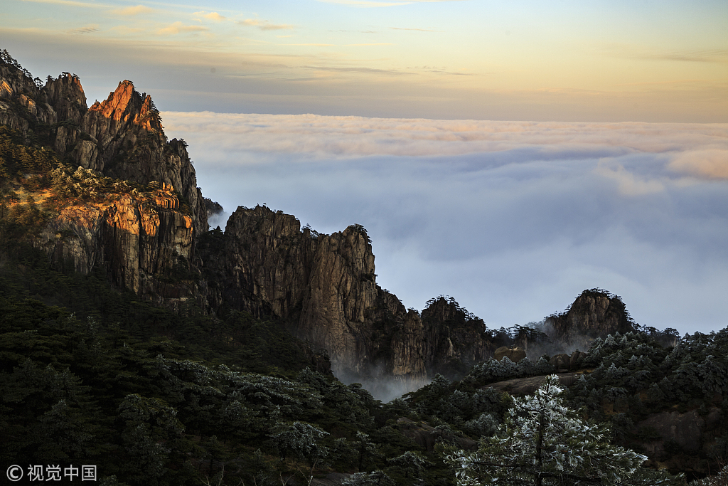 安徽黄山:晚霞云海雾淞群艳争辉