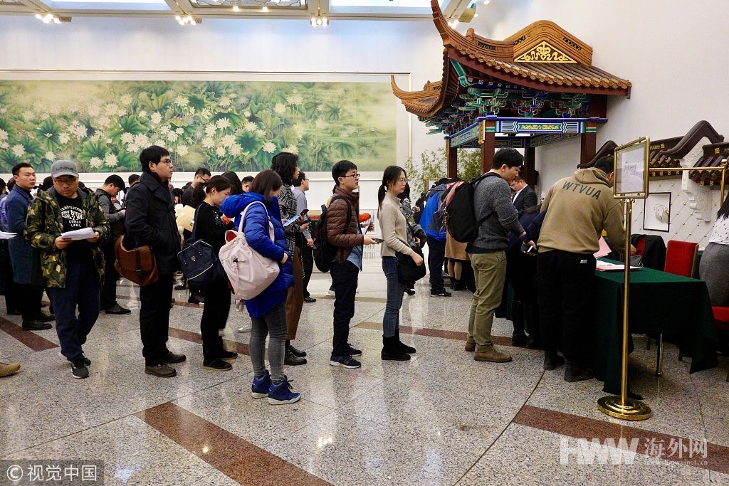 2019年3月1日,北京,参加报道十三届全国人大二次会议的媒体记者在人民大会堂领取证件。