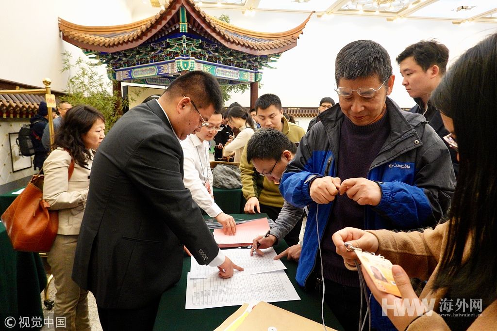 2019年3月1日,北京,参加报道十三届全国人大二次会议的媒体记者在人民大会堂领取证件。