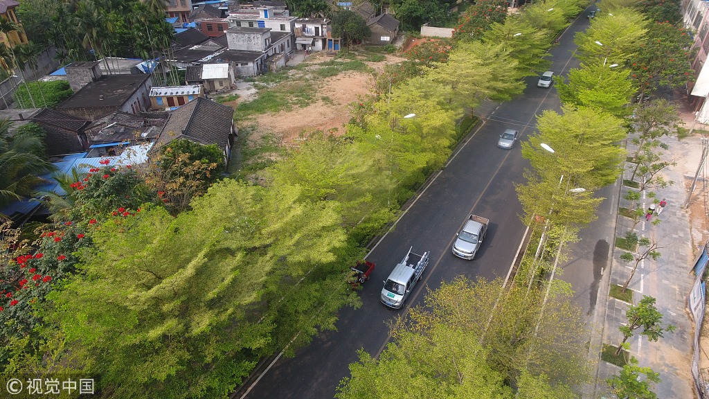 2019年3月3日,海南琼海,车辆行驶在金黄色的榄仁树林中。