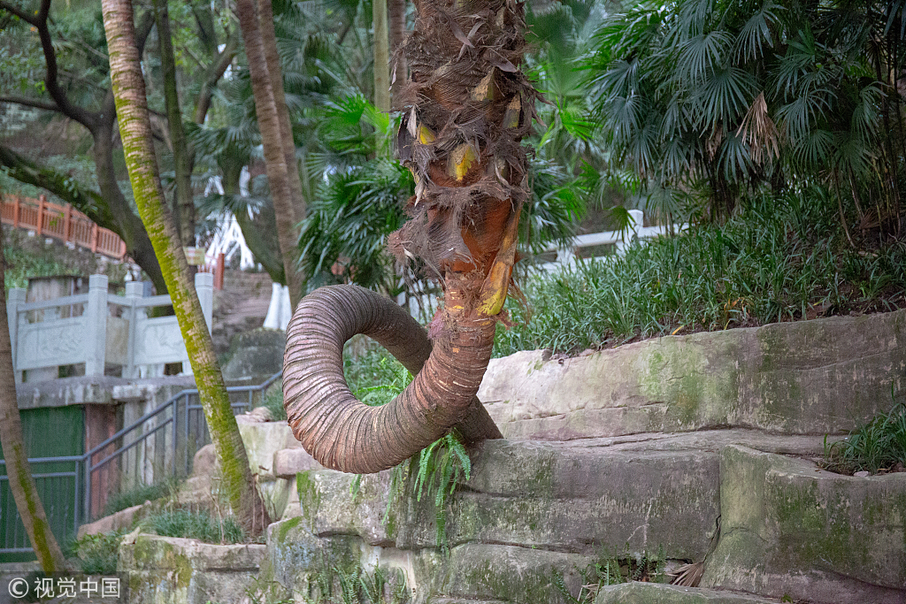 2019年3月4日,重庆渝中区某公园内,一颗360度扭曲生长的棕榈树格外显眼,不少路过市民戏称该树为“树歪歪”。