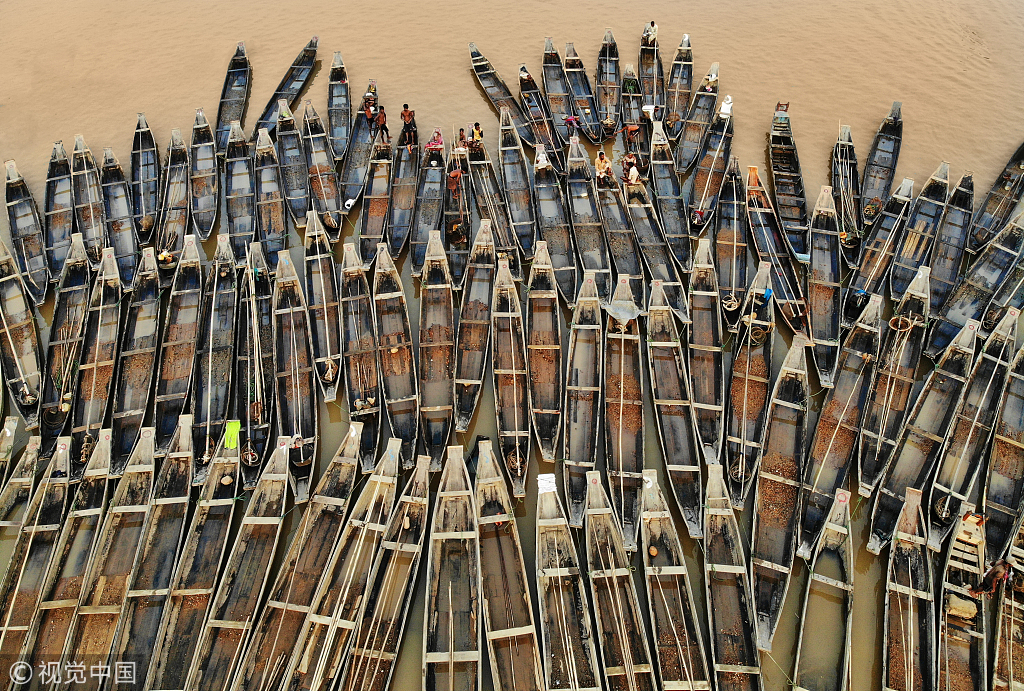 孟加拉国:航拍数百艘木船停靠岸边 密密麻麻场面壮观