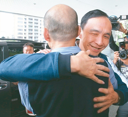 朱立伦(右)南下拜会韩国瑜(左),朱立伦特地给韩国瑜一个大拥抱。(图片来源:台湾《联合报》)