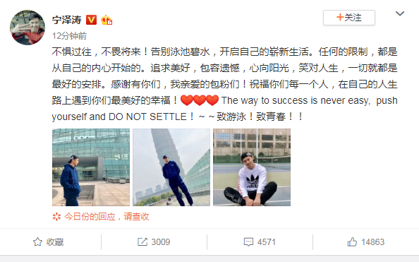 【环球网综合报道】3月6日15时06分,游泳运动员宁泽涛在微博@宁泽涛 发文称“告别泳池碧水,开启自己的崭新生活”,宣布退役。