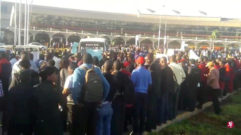 (内罗毕国际机场员工罢工,航站楼外聚集大量旅客 图源:路透社)