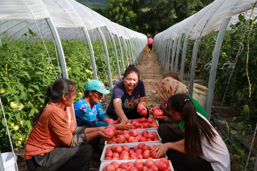 赵会杰和村民们在蔬菜大棚了解西红柿的生长情况。2018年8月14日,李国志摄