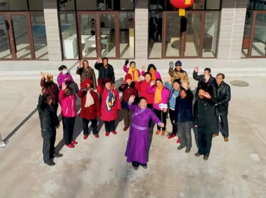 赵会杰和村民们站在小庙子村党群活动中心前,一起自拍录视频。