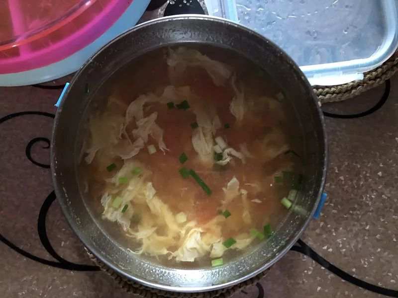 把玉米剥成粒,炒到熟透,番茄鸡蛋汤里掺杂一些肉末,菜薹多炒5分钟让它更软……