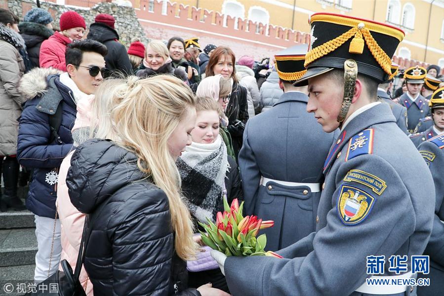 当地时间2019年3月8日,俄罗斯莫斯科,士兵在街头向女性免费发放鲜花庆祝国际妇女节。 (图片来源:视觉中国)