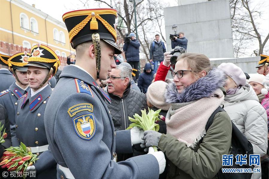 当地时间2019年3月8日,俄罗斯莫斯科,士兵在街头向女性免费发放鲜花庆祝国际妇女节。 (图片来源:视觉中国)