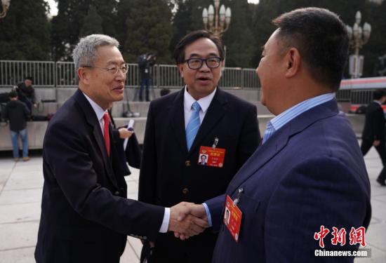 全国政协委员刘炳章(左)、卢伟国(中)、刘伟(右)在进入会场前就粤港澳大湾区进行交流。中新社记者 崔楠 摄