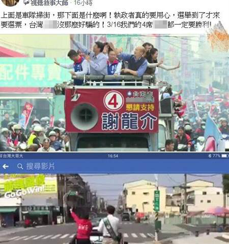 有网友在脸谱网(facebook)上贴出郭国文和谢龙介扫街人气对比图,说觉得被逗乐了!“上面是车队扫街,那下面是什么啊!执政者真的要用心,选举到了才来要选票”,台湾民众没那么好骗的!“3/16我们的4席‘立委’都一定要胜利!”