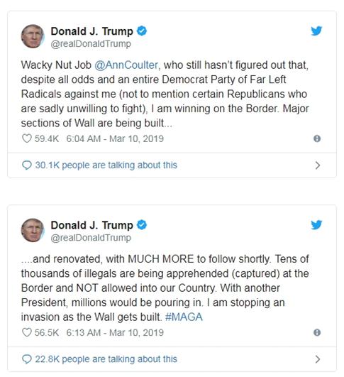 特朗普在推文中直接点名库尔特,称她为“古怪的疯子”,并申诉道:“竟然还看不出来……在建墙问题上,我正在赢。墙的主要分区已经在建了……也在修复,最近还有很多新的动态。上万非法(移民)没有得到入境许可,正被扣在边境。如果换个总统,早就有上百万涌进来了。在推进边境墙工程的同时,我正在阻止一场入侵。”