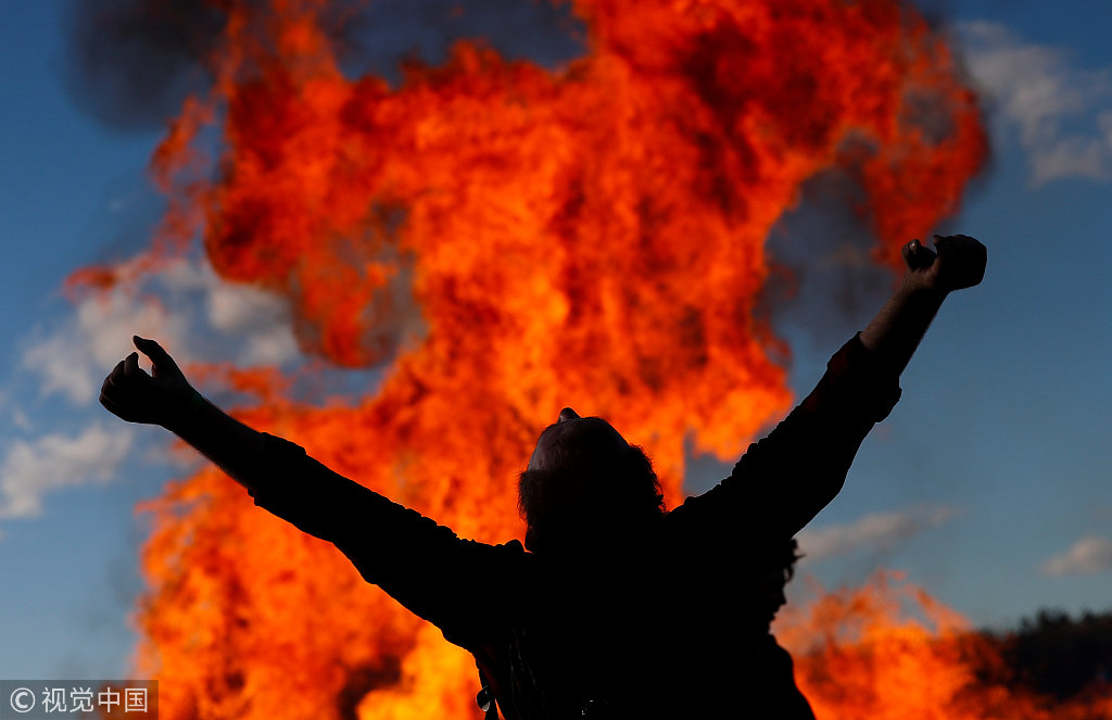 当地时间2019年3月9日,俄罗斯卡卢加地区尼古拉勒尼韦茨村,当地庆祝“马斯伦尼察”(Maslenitsa)节,人人们点燃一座木质托盘制成的塔,纪念冬天的结束。