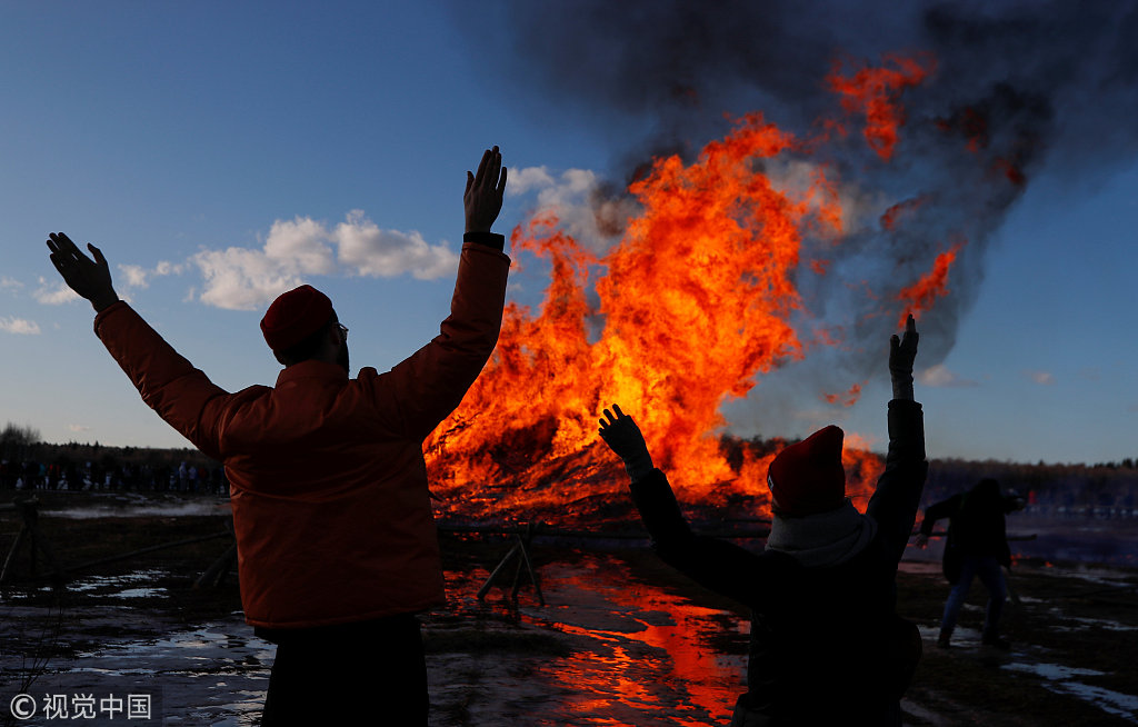 当地时间2019年3月9日,俄罗斯卡卢加地区尼古拉勒尼韦茨村,当地庆祝“马斯伦尼察”(Maslenitsa)节,人人们点燃一座木质托盘制成的塔,纪念冬天的结束。