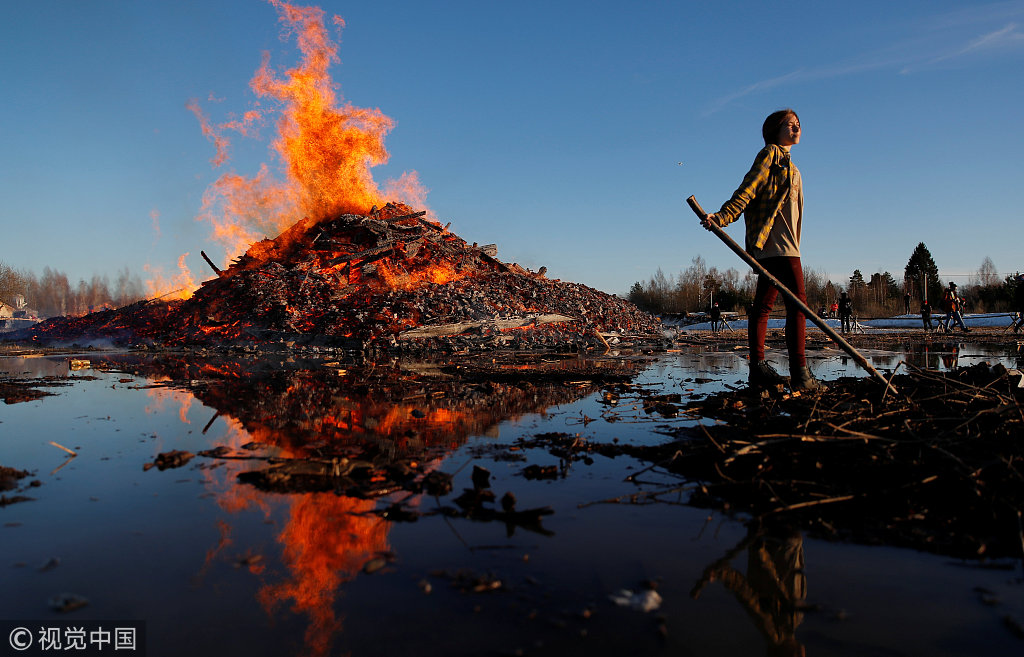 当地时间2019年3月9日,俄罗斯卡卢加地区尼古拉勒尼韦茨村,当地庆祝“马斯伦尼察”(Maslenitsa)节,人人们点燃一座木质托盘制成的塔,纪念冬天的结束。