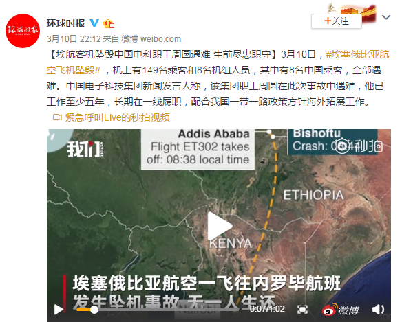 联合国官方微博消息,据报道,当地时间10日上午,一架从亚的斯亚贝巴飞往肯尼亚首都内罗毕的埃塞俄比亚航空ET302航班客机在起飞后不久发生意外事故坠毁,机上载有来自中国、美国、沙特、印度等35个国家的149名乘客及8名机组人员,他们都在此次空难中不幸罹难,其中包括至少19名联合国工作人员。