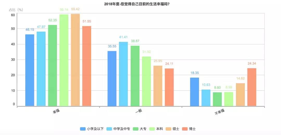 大调查发现,从学历来看,硕士(59.42%)和本科学历受访者(59.14%)感觉幸福的比例最高。