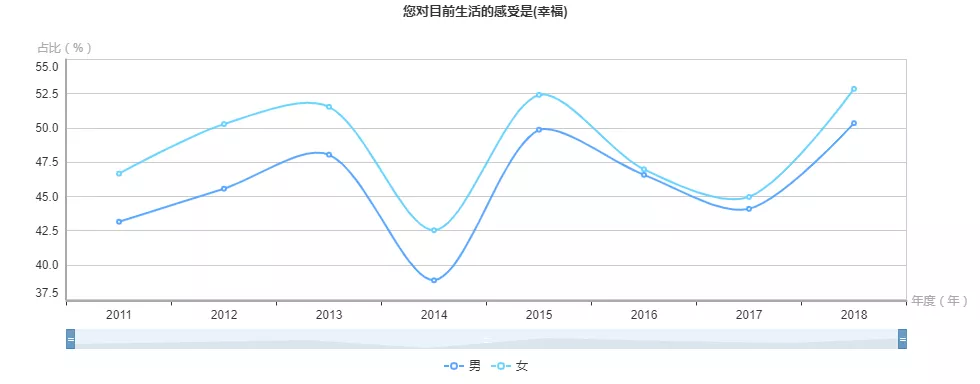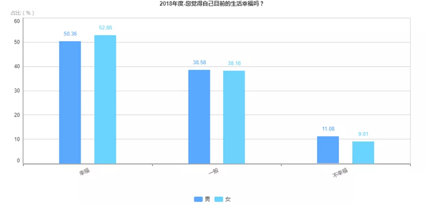 大调查发现,女性受访者(52.86%)选择幸福的比例略高于男性(50.36%)。这已经是连续8年,女性受访者选择幸福的比例高于男性。