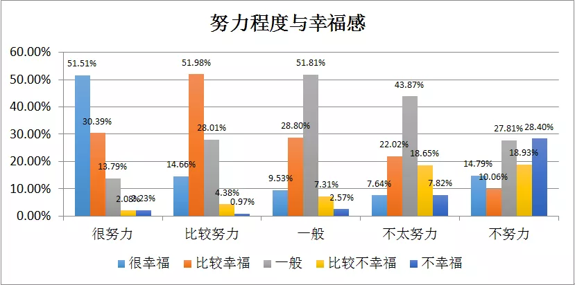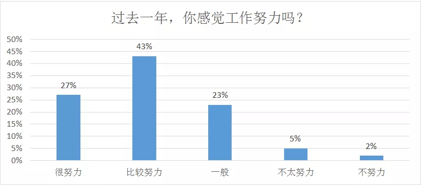 大调查针对网上4万网友调查发现,近三成的受访者(27%)认为,过去一年工作很努力;超过四成的受访者(43%)认为比较努力。随着努力程度的提升,幸福的感受也在提升,选择“很努力”工作的受访者当中,超过八成的人感觉幸福,其次是“比较努力”(感觉幸福66.64%),而不努力的受访者感觉不幸福的比例是最高的(47.33%)。