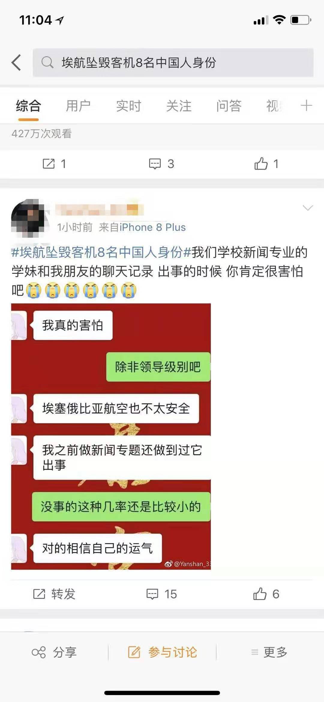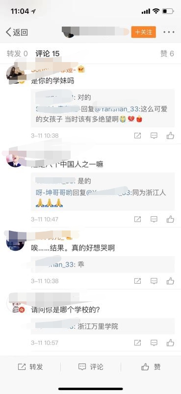 很多网友说,“千万别上那架飞机”。一位网友写道,“你这么可爱的女孩子,如果有机会是不是可以邀请你来成都看大熊猫,长颈鹿好多地方都可以看,我也喜欢野生动物,我们同岁,说不定有很多话可以聊,所以别上那趟飞机了好不好。”