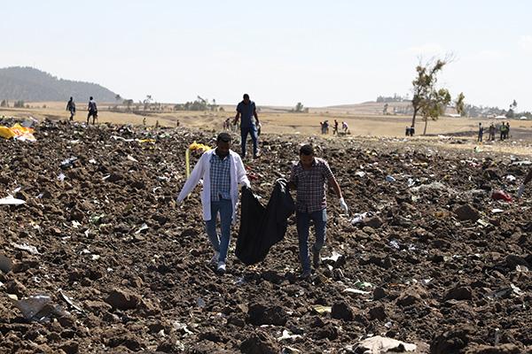 3月10日,在埃塞俄比亚首都亚的斯亚贝巴附近,救援人员在坠机现场工作。 新华社 图3月10日,埃塞俄比亚航空公司失事的ET 302航班在起飞过程中经历了一次奇怪的下降。
