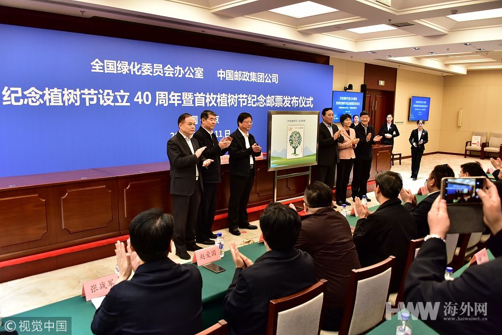 邮票印制使用绿色系专色油墨,在紫外灯光下会展现枝繁叶茂的景致、“40”和“履行植树义务,共建美丽中国”字样。