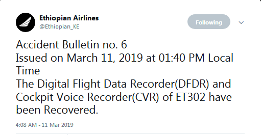 埃塞俄比亚航空于当地时间11日发布消息,飞机的黑匣子已经找到。