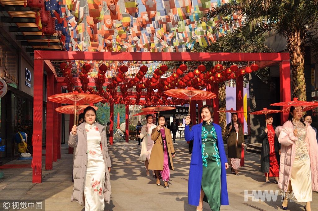 2019年3月12日,在湖南省郴州市苏仙区,妇女职工进行旗袍秀快闪表演。