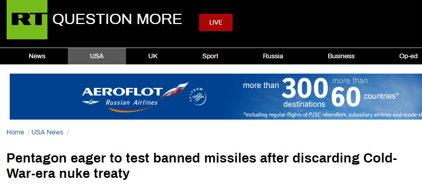 《中导条约》于1987年制订,该条约禁止生产射程在500公里到5500公里间的核导弹和常规地面发射的导弹。RT称,美俄官员均担心特朗普退出该条约是一种为了研制被条约所禁止武器的借口。