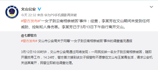 13日晚,云南省文山壮族苗族自治州公安局发布通报回应此事称,3月12日10时许,文山市公安局通过网络发现,一网民反映一名女子到云南相亲被困,随即开展找寻工作,14时24分,警方首次接到该女子报警称不愿意在文山与王某青生活,请求公安机关送其离开,民警立即前往调查处理。