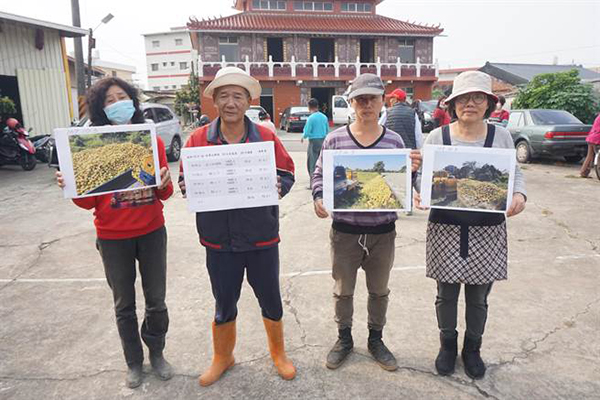 13日下午麻豆柚农郭新聪(左二)与其他柚农拿出去年照片,证明去年麻豆柚子确实因产量过剩卖不好,个别果农将自家卖不出去的柚子倾倒在自家果园土地旁。(图片来源:台湾“中时电子报”)
