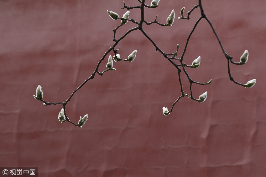 2019年3月13日傍晚,北京西长安街,玉兰花的蓓蕾星星点点辉映着红墙,已经绽放的玉兰花儿还没有完全舒展开来,长安街一派早春欣欣向荣的景象。