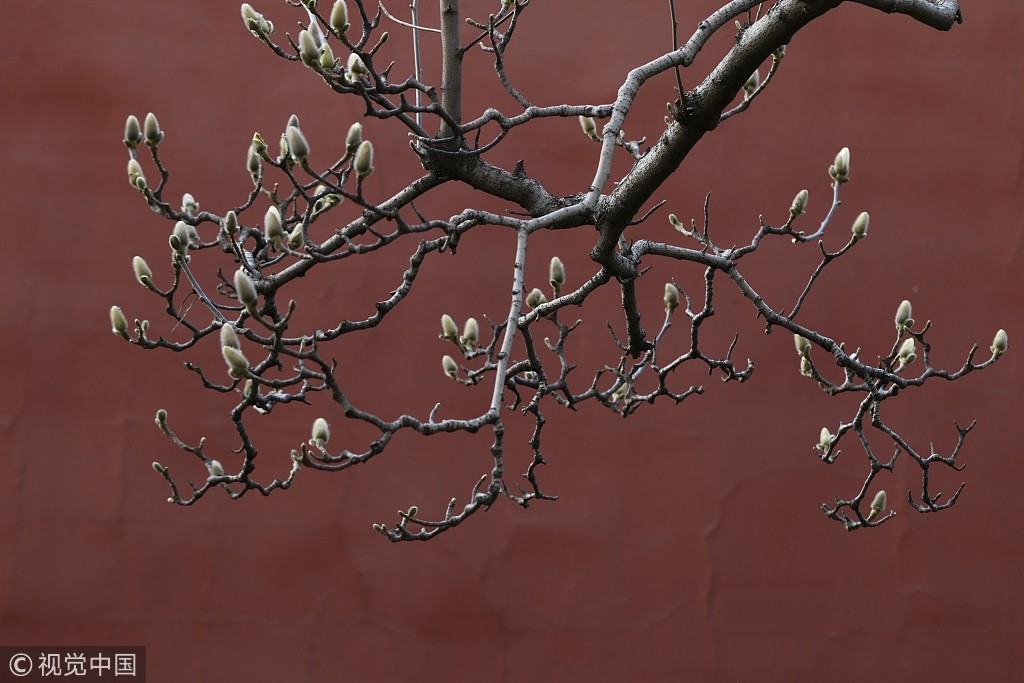 2019年3月13日傍晚,北京西长安街,玉兰花的蓓蕾星星点点辉映着红墙,已经绽放的玉兰花儿还没有完全舒展开来,长安街一派早春欣欣向荣的景象。
