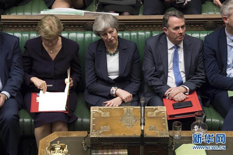 3月13日,在英国伦敦,英国首相特雷莎·梅(中)出席议会下院投票。英国议会下院13日投票决定,反对英国在任何情况下“无协议脱欧”。 新华社发(英国议会摄影师马克·达菲摄)