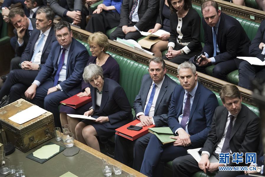3月13日,在英国伦敦,英国首相特雷莎·梅(中)出席议会下院投票。英国议会下院13日投票决定,反对英国在任何情况下“无协议脱欧”。 新华社发(英国议会摄影师杰西卡·泰勒摄)