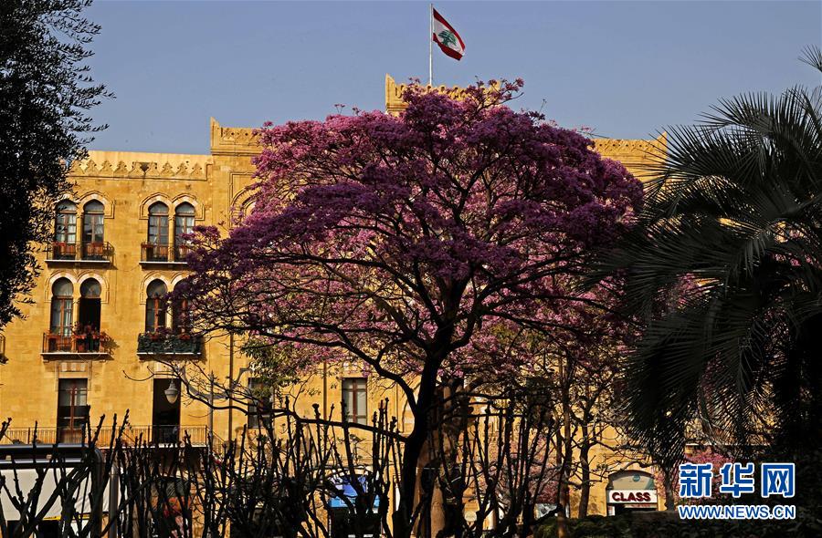 3月13日,在黎巴嫩首都贝鲁特市中心,街道旁树木上的花儿盛开。 新华社发(比拉尔·贾维希摄)
