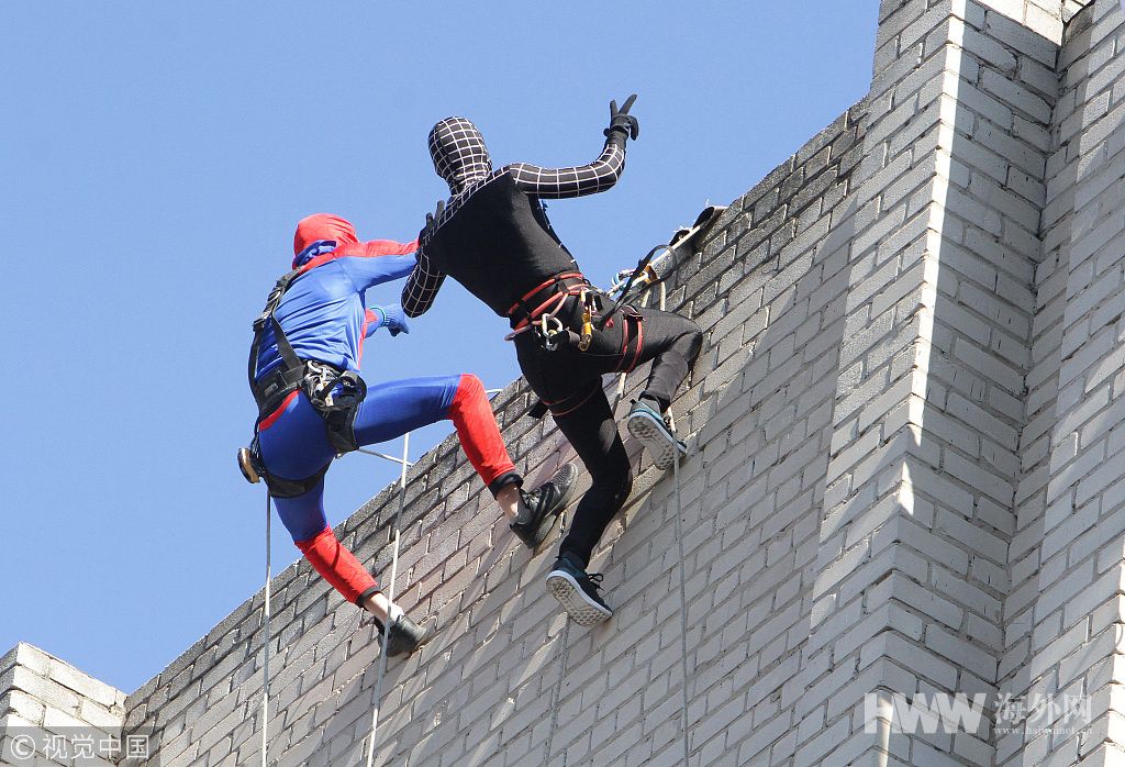 当地时间2019年3月6日,乌克兰第聂伯罗,工人装扮成超级英雄,在儿童医院的天台上从天而降透过窗户逗乐病童们。