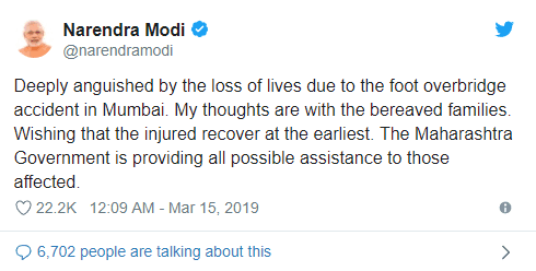 在事件发生后,印度总理莫迪在推特上发文表示哀悼,并祈祷伤者早日康复。他写道,“我对孟买发生的人行桥坍塌事故中逝去的生命感到极度痛心。我的心与逝者的家人们同在。愿受伤的人能够早日康复。马哈拉施特拉邦政府正在为受害者提供一切可能的援助。”