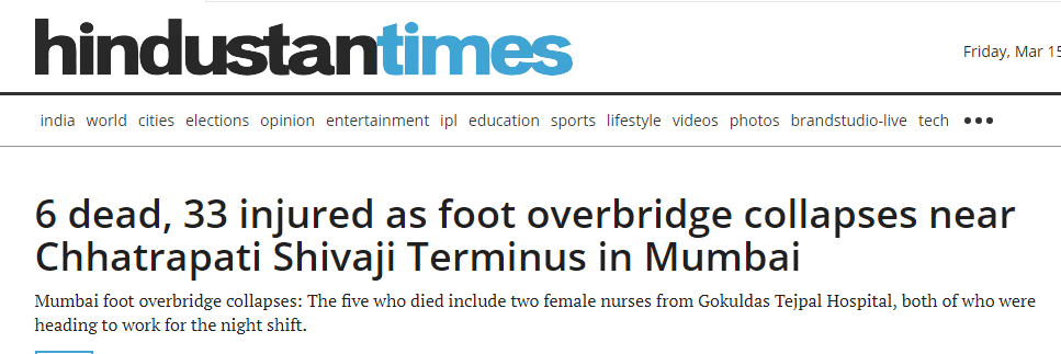 【环球网报道 记者 崔天也】14日晚,印度孟买繁华地区的一段人行桥突然坍塌,造成至少6人死亡,33人受伤。《印度斯坦时报》说,人行桥垮塌发生在高峰时段,行人众多,因此伤亡严重。此事件不仅点燃了印度政坛“相互指责的游戏”,也凸显了作为印度经济首都的孟买,基础设施建设是个什么水平。