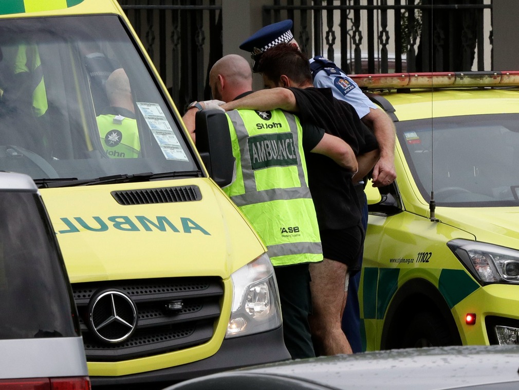 袭击发生后,新西兰总理阿德恩发表全国讲话,表示“这是新西兰最黑暗的一天之一”。 图为一名受害者被医生和警察搀扶的走进救护车(来源:美联社)