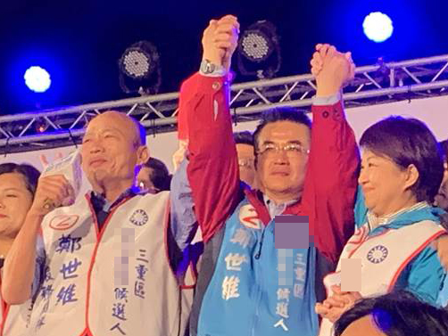 韩国瑜(左)卢秀燕(右)紧握郑世维手,高呼加油。(图片来源:台湾“中时电子报”)