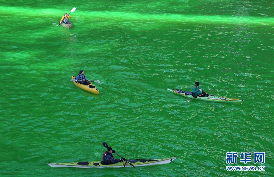 3月16日,在美国芝加哥,人们在染绿的芝加哥河上划艇。 当日,芝加哥市民和游客聚集在芝加哥河两岸,观看染绿河水的活动。每年3月17日的圣帕特里克节是爱尔兰传统节日,为纪念爱尔兰守护神圣帕特里克而设立。 新华社记者王强摄